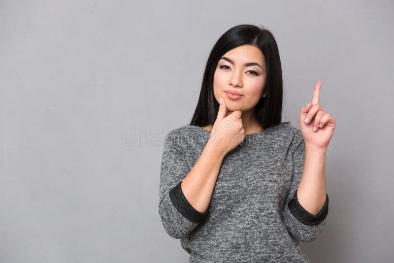 Asiatisk flicka som har en idé. Härlig allvarlig asiatisk flicka i grått förkläde som pekar upp med ett finger och har en idé