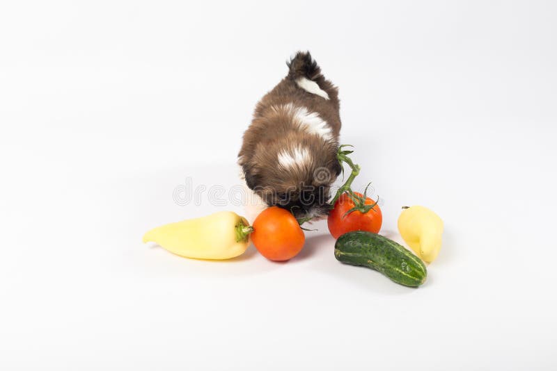 Liten shihtzuvalp med grönsaker som isoleras på den vita bakgrunden