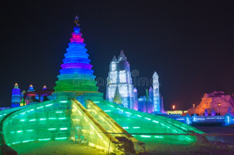 Den härliga isgravyrbyggnaden i Harbin av Kina Taget från den Harbin snö- och isvärlden i festival för vår 2015