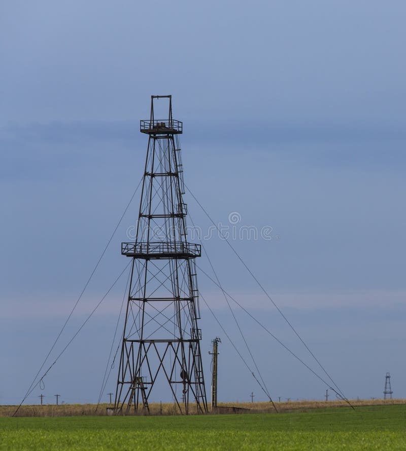 Övergiven fossila bränslenrigg som profileras på himmel